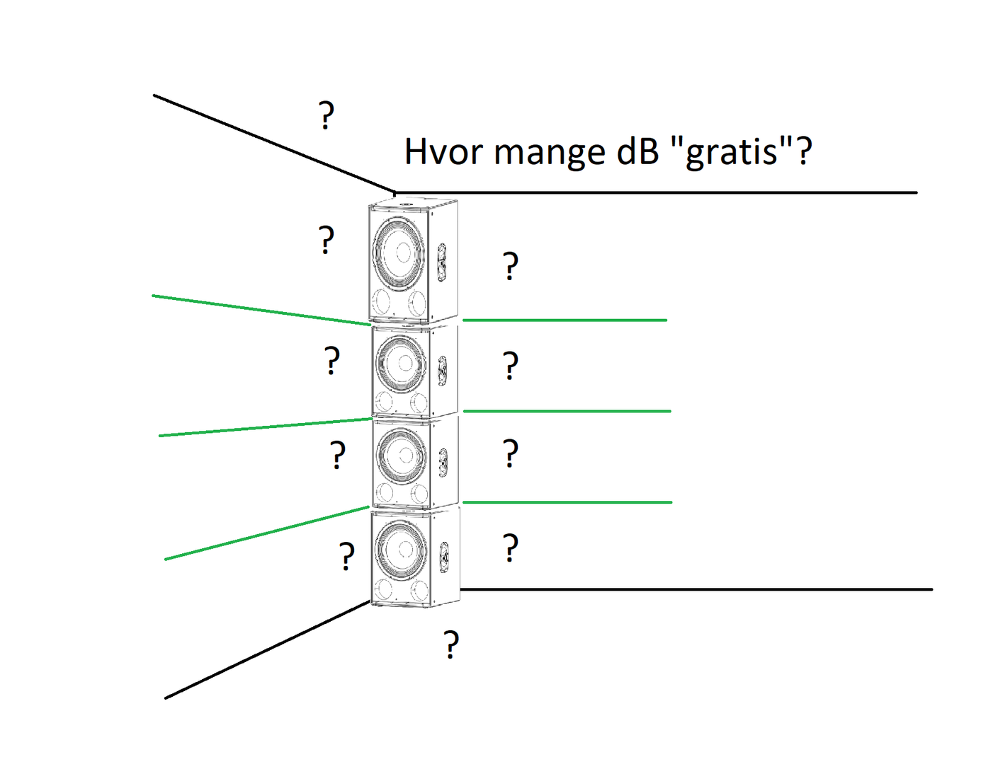 Rommets bidrag er i mange analyser definert som "bidragsyter" med dB ift flater. Et hjørne har flere flater enn midt i rommet, men hvor mange GRATIS dB vil man oppnå med en plassering som på vedlagte skisse?