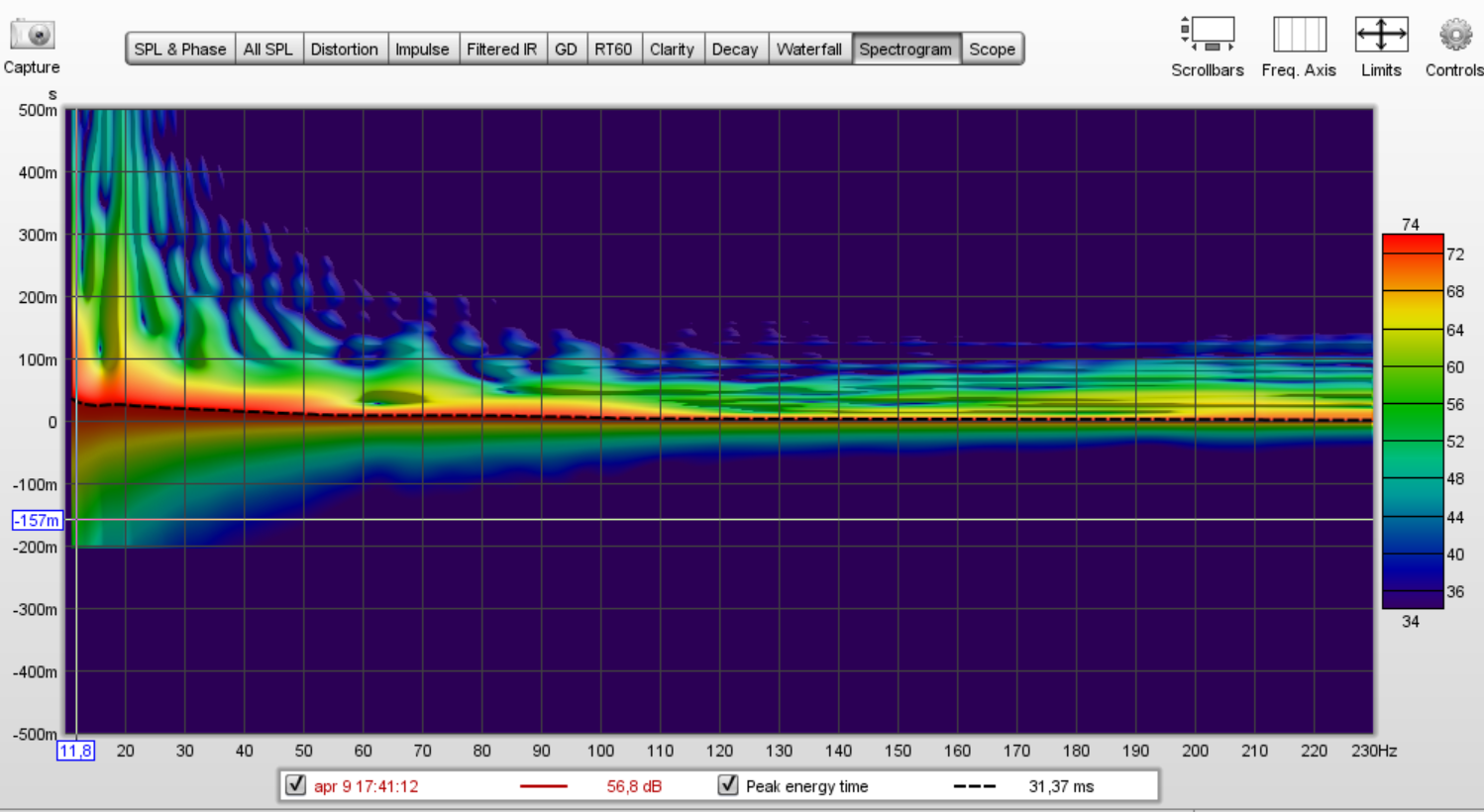 Du kan begynne med å bytte fra lineær peak til log spl. Så igjen kan jeg anbefale folk å snu grafen, men klart får gjøre som man vil. Du kan også øke span til 500 after.