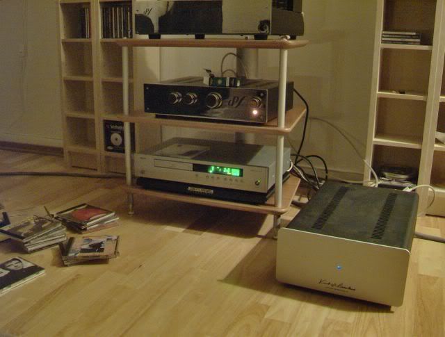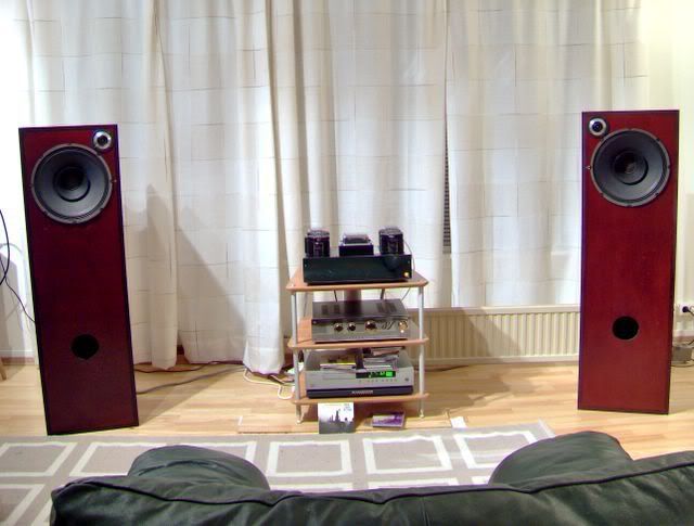Til slutt et lite glimt av lytteposisjonen og den deilige sofaen. Den er utrolig god å ligge i, så den klarer alltid å utkonkurrere stresslesser og separate lyttestoler. Videre blir så direktestrålende høyttalere ganske kjedelige hvis man havner for langt off-axis. Derfor var det et gunstig trekk å la anlegget spille i lengste romretning. At rommet spiller litt mer med da, det tror jeg også er å foretrekke i mitt spesifikke tilfelle. Her er jeg likevel åpen for å forandre mening etterhvert.