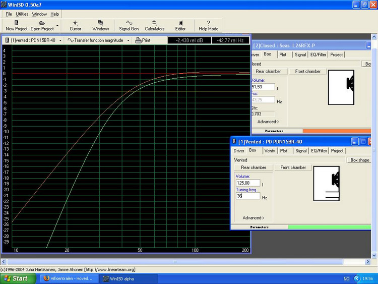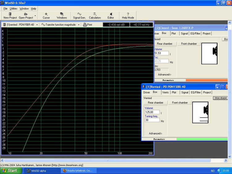 Det er med ikke rent lite frykt jeg nå så smått begynner å meddele lydinntrykk. Hot topic! Jeg regner likevel med at oppegående hfsere blir litt snurt om jeg bare forteller om hvilken lakk jeg har tenkt å bruke som finish? Eller henviser til simulert kurve av basselementet i aktuelle kasse? (Ok, hvis noen tenner på slikt, så er bassene simulert i WinIsd på DIY-hjørnet ;D)