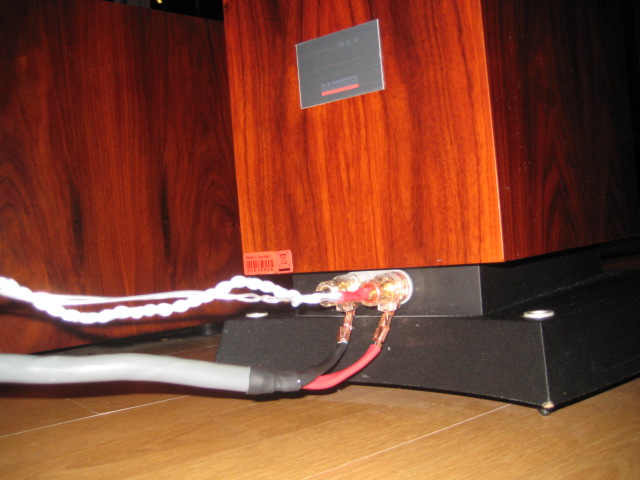 Høytalerne mottar strømmen fra PSFP DIY 4x2,5mm2 med kobberspader+2,4mm2 sølvkabler av Geir Molid og HGA inn på Nordost Shogun Z-banan-plugger.Alt sølvloddet.