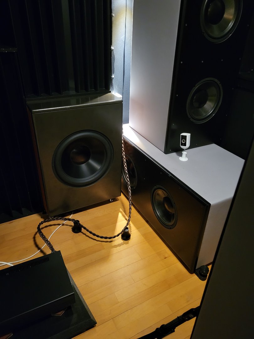 Mine hi--fi venner Renè og Poul mener, at de to 18 tommer er rigelig også, og jeg skulle få de højttalere der ikke bruges, ud af rummet, fordi de påvirker lyden negativt. Ved lytning til dyre højttalere er der kun et sæt i lytterum/demorum. Når jeg får mulighed, vil jeg have de brugte subwoofere ned bagerst i rummet eller ud, for at kunne placere de to 18 tommer mere optimalt. Altså usymmetrisk. Jeg vil prøve at sælge dem, også for at neddrosle. Måske beholde den tredje, som 2x15 tommer, under centerhøjttaleren, der så løfter centeren op i rette højde. Den er dækket af de tunge Svanå Teknik V-wings.