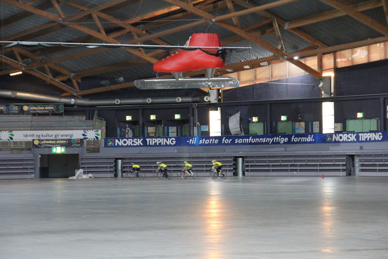 Historisk dag i Vikingskipet i går, da Ottestad Yngres var invitert til å teste forholdene. Det har etter hva jeg vet ikke vært syklet i hallen siden velodromen ble hugget opp etter Sykkel-VM 1993.