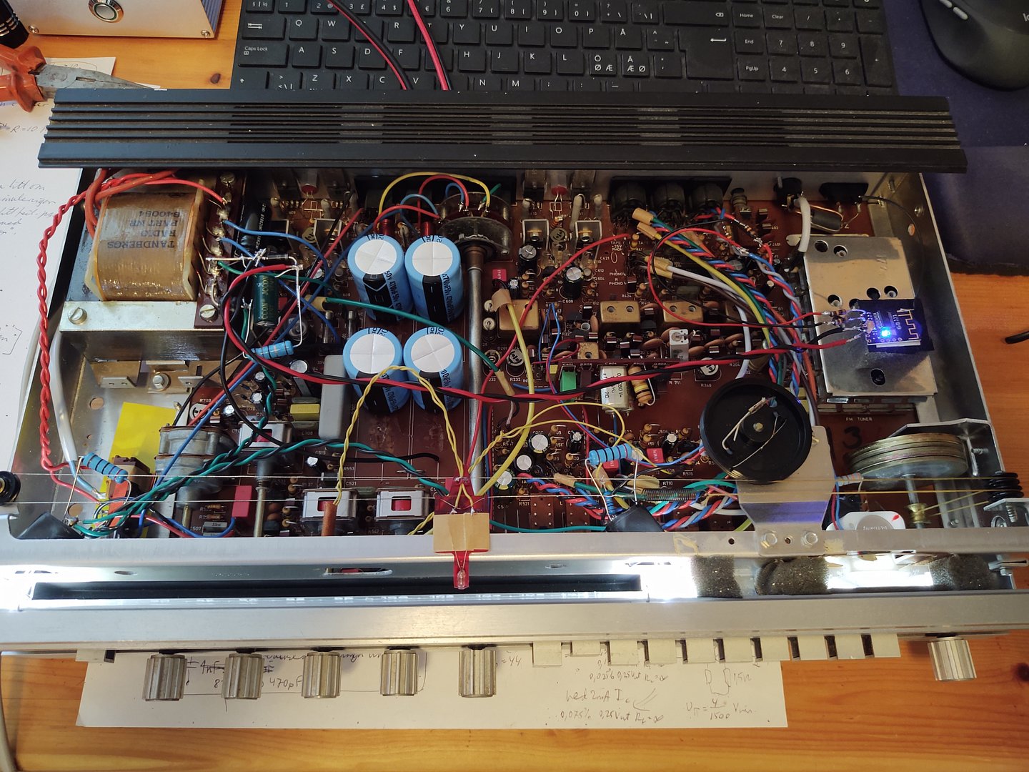 Har overhalet en TR200 selv. Etter bytte av alle elektrolyttkondensatorer gikk forforsterkeren i selvsving. Måtte koble noen små kondensatorer, 33nF i parallell med den lokale strømforsyningskondensatoren. Jeg har også modifisert utgangstrinnet litt slik at det er mer lineært enn orginalt før motkobling, samt byttet gamle småsignaltransistorer med nye bc550c, bc560c, bc556b. Elekrolytter i signalveien er byttet ut med bipolare og film kondensaterer der det lot seg gjøre. Har også integrert inn Bluetooth mottaker, men kvaliteten på den er sånn passe. Har en annen type i bestilling, så den blir kanskje byttet ut. Dette er en fin liten receiver. :)