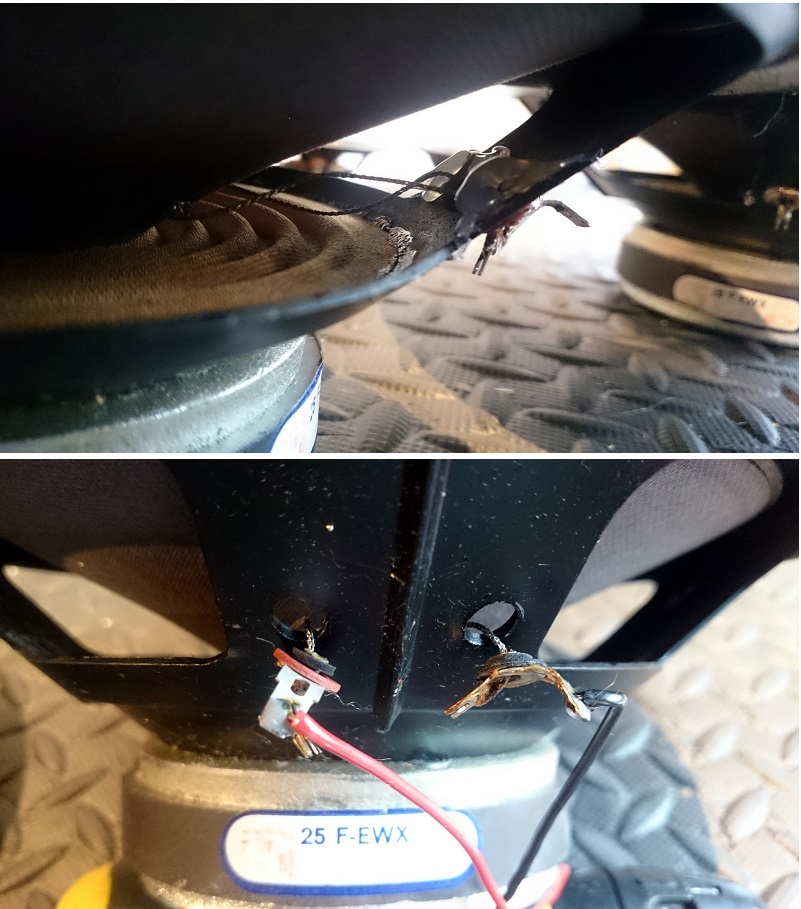 I noticed that the wire tags on the bass drivers had come loose (see photos) so I have fixed them and made them secure again. I think they may have made a bit of a rattling noise at high volumes!