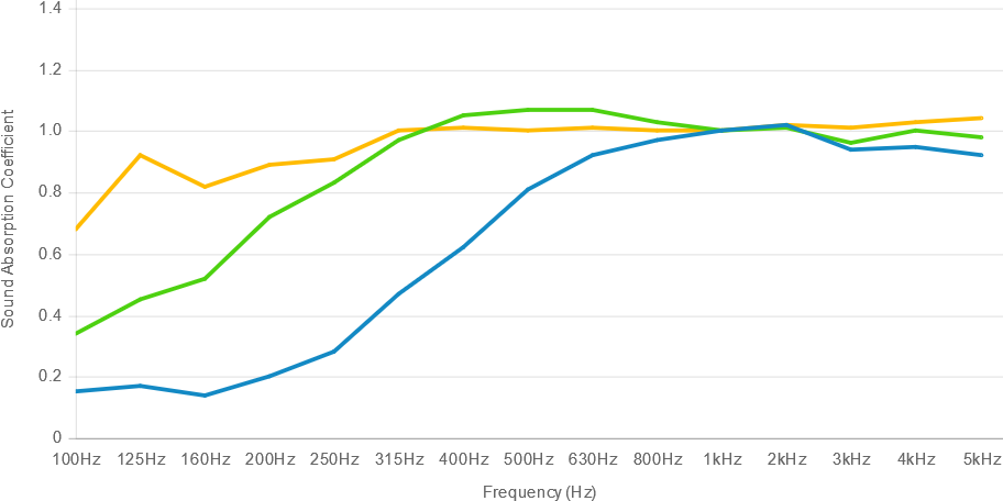 Når det kommer til akustikk har jeg stort sett drevet med brannslukking i form av gode akustikkpaneler på alle fire veggflater, i hovedsak i førsterefleksjonspunktene. Panelene jeg har brukt er fra Primacoustic og er relativt bredbåndet (gul linje):