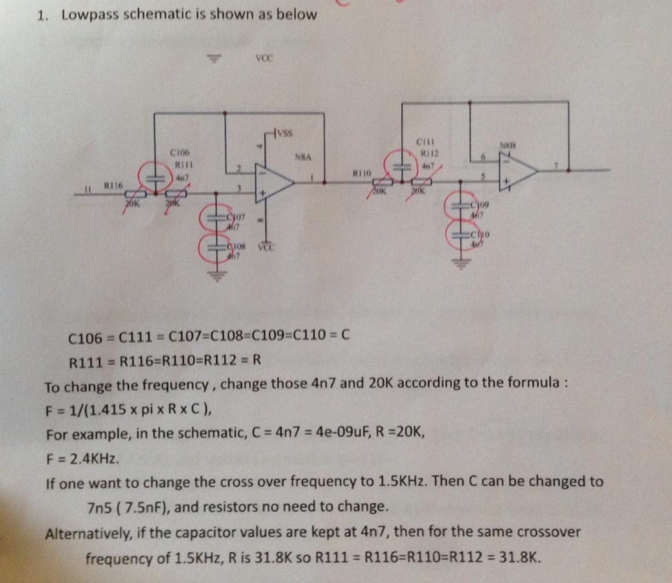 Gjelder bare høypassdelen når jeg ser etter. De som heter 2R har dobbel verdi av R. Motstandene R er 12k og 2R er 24k. Skriver på tlf så jeg så ikke helt etter. Kan sette opp en komponentliste hvis du vil være sikker med forslag til gode komponenter.