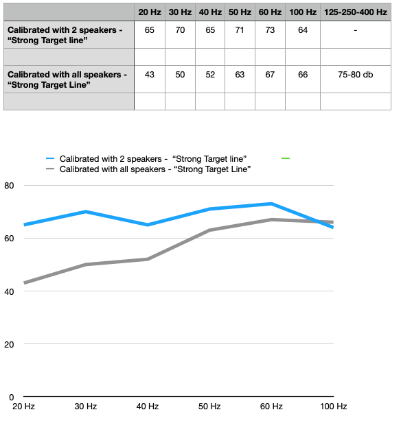 Jeg gjør en grov feil, eller så er kalibreringen på min A32 helt på jordet. Tabellen viser h.h.v. kalibrering med kun 2 høyttalere og alle høyttalerne. Målingen er gjort i 2-kanals lyd. Jeg har enkelt brukt et "Sound Meter" av enkel type. Selv om denne skulle ha unøyaktiger, forklarer ikke det den kraftige avrullingen i bassen ved kalibrering med alle høyttalerne.