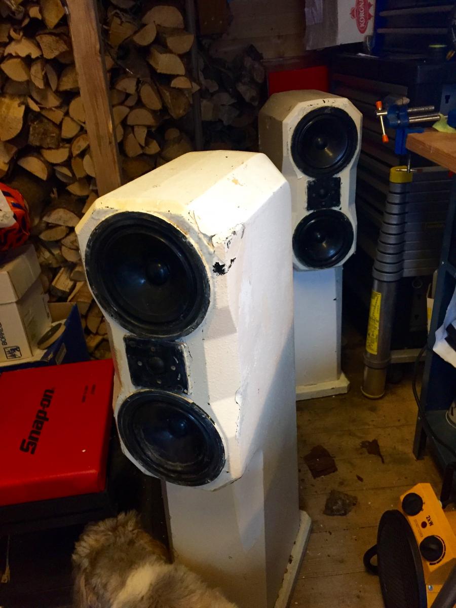 etter det jeg kunne se, var det fire lag med forskjellig maling over originalmalingen. Kunne ikke se noen dype sår eller skader i støpen på disse, så det blir til at de blir pusset ned, evt sparklet og malt opp på nytt. Jeg er ingen malingsekspert, men lurer på om feks hvit bengalakk kan gjøre seg på disse. De opprinnelige mørk brune tresoklene er også malt hvite, her blir det å pusse ned og beising med mørk beis. Har ikke testet høyttalerelementene, men de virket veldig stive i opphenget, så de bør nok få en grundig sjekk. Elementene har dessuten blitt delvis malt de også, så de må gjøres noe med uansett. Ser at Rauna selger oppgraderingskit til disse, komplette elementer og delefiltere, men prisen er SEK 7500,- og det er over hva jeg har lyst til å legge i disse. Hva som skjer er ikke avgjort, så vi får se etterhvert.Oi.Nye høyttalere inn i Fjøset i dag. Dette blir vinterens prosjekt tenker jeg. For de som lurer, Rauna Ymer