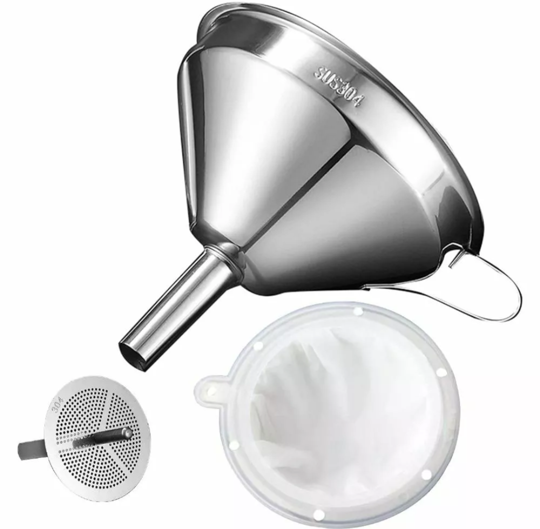 Kjøp en finmasket "funnel" på ebay og sil igjennom den. Koster bare en hundrelapp.
