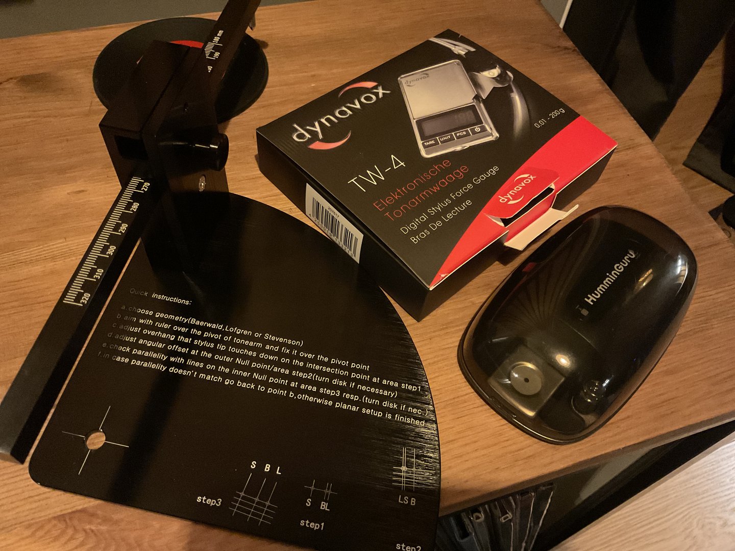 Stakk innom Lydglede etter jobb og kjøpte en Dynavox, og riktig nok: Humminguru viser 0.1g for mye. Den stemmer på 0.5g loddet som følger med , men har misvisning når man kommer opp mot 2g. Kontrollmåling med en Ortofonvekt (klin identisk med Dynavoxen for øvrig) og en manuell «vippe» fra Clearaudio, viser at det er Humminguruen som viser feil. Ikke mye, men dog.